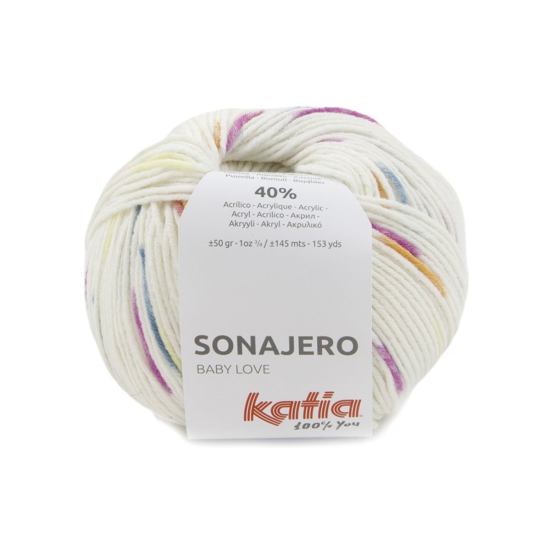 Katia Sonajero es un hilo especialmente diseñado para prendas de bebés y niños, caracterizado por su suave estampado de colores sobre una base blanca o de tonos muy suaves, con un efecto moteado tipo spray. Esta combinación de colores crea un efecto visual atractivo y delicado, ideal para prendas infantiles.