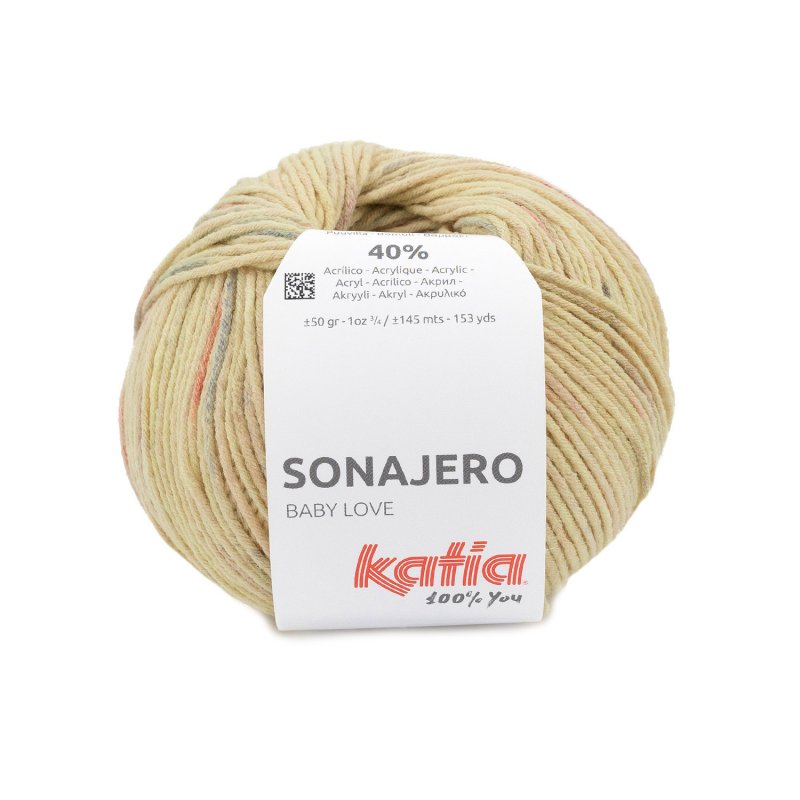 Katia Sonajero es un hilo ideal para tejer prendas para bebés y niños, destacado por su suave estampado de colores sobre una base blanca o en tonos suaves, con un efecto moteado tipo spray. Esta combinación de colores ofrece un efecto visual atractivo y delicado, perfecto para ropa infantil.