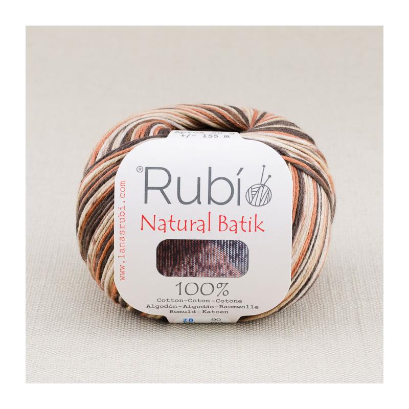 Rubí Natural Batik es una lana de alta calidad y exclusiva, compuesto por 100% algodón egipcio doble peinado y gaseado. Las fibras extremadamente largas de este algodón le confieren un brillo, suavidad y resistencia sin comparación, lo que lo hace ideal para tejer prendas de vestir y accesorios de bebé.